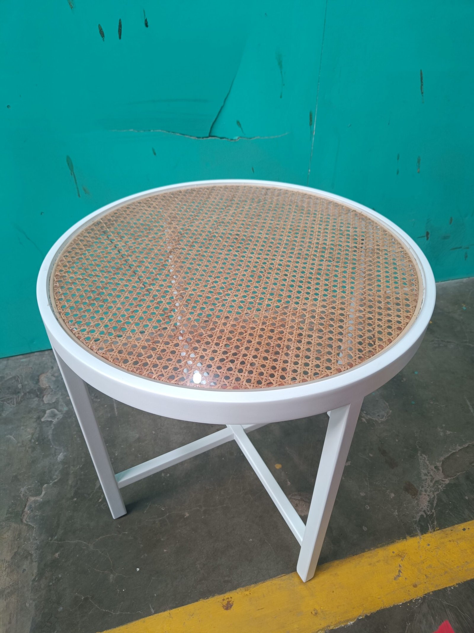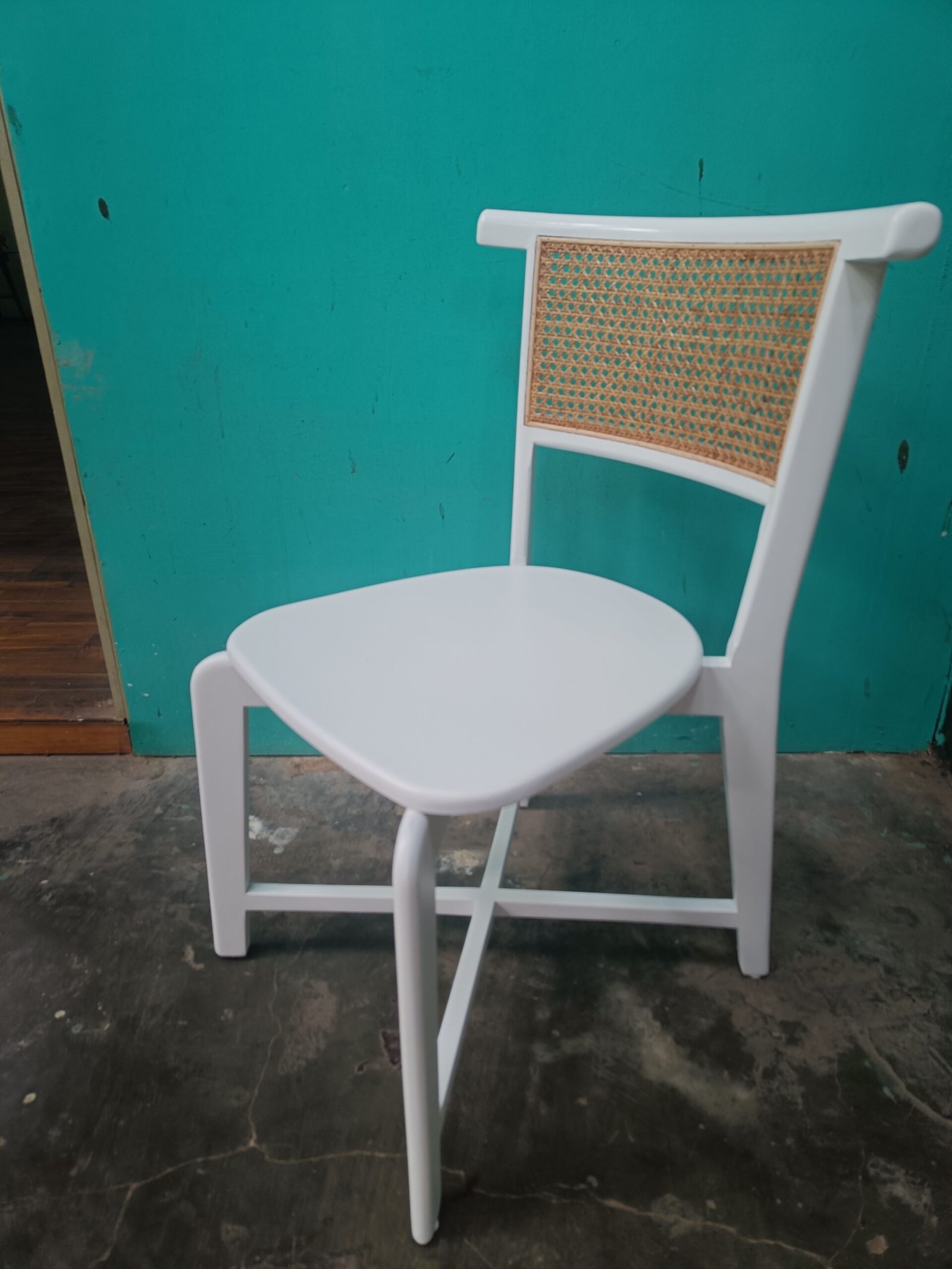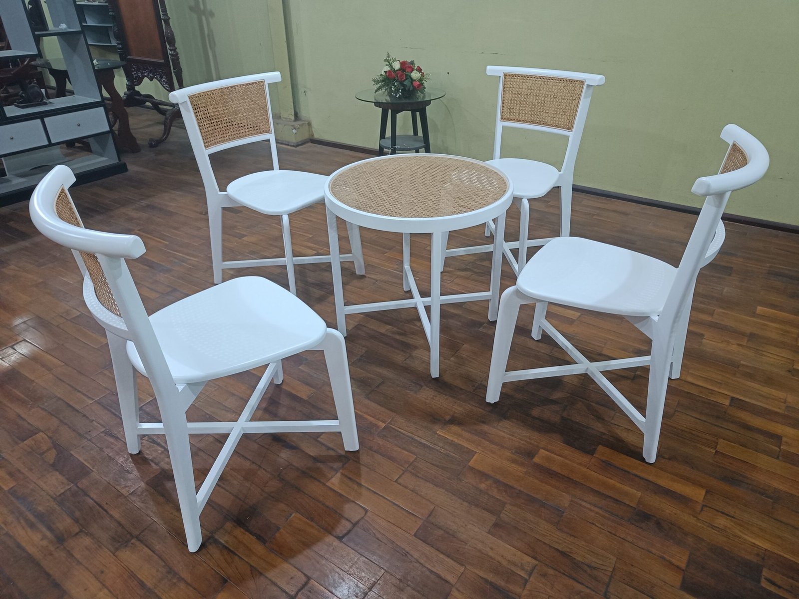 Round table and 4 white-framed chairs featuring woven rattan backrests. A lightweight, stylish, and highly Instagrammable design. Ideal for the patio, balcony, or a cozy lounge corner. Create a bright and trendy atmosphere now!